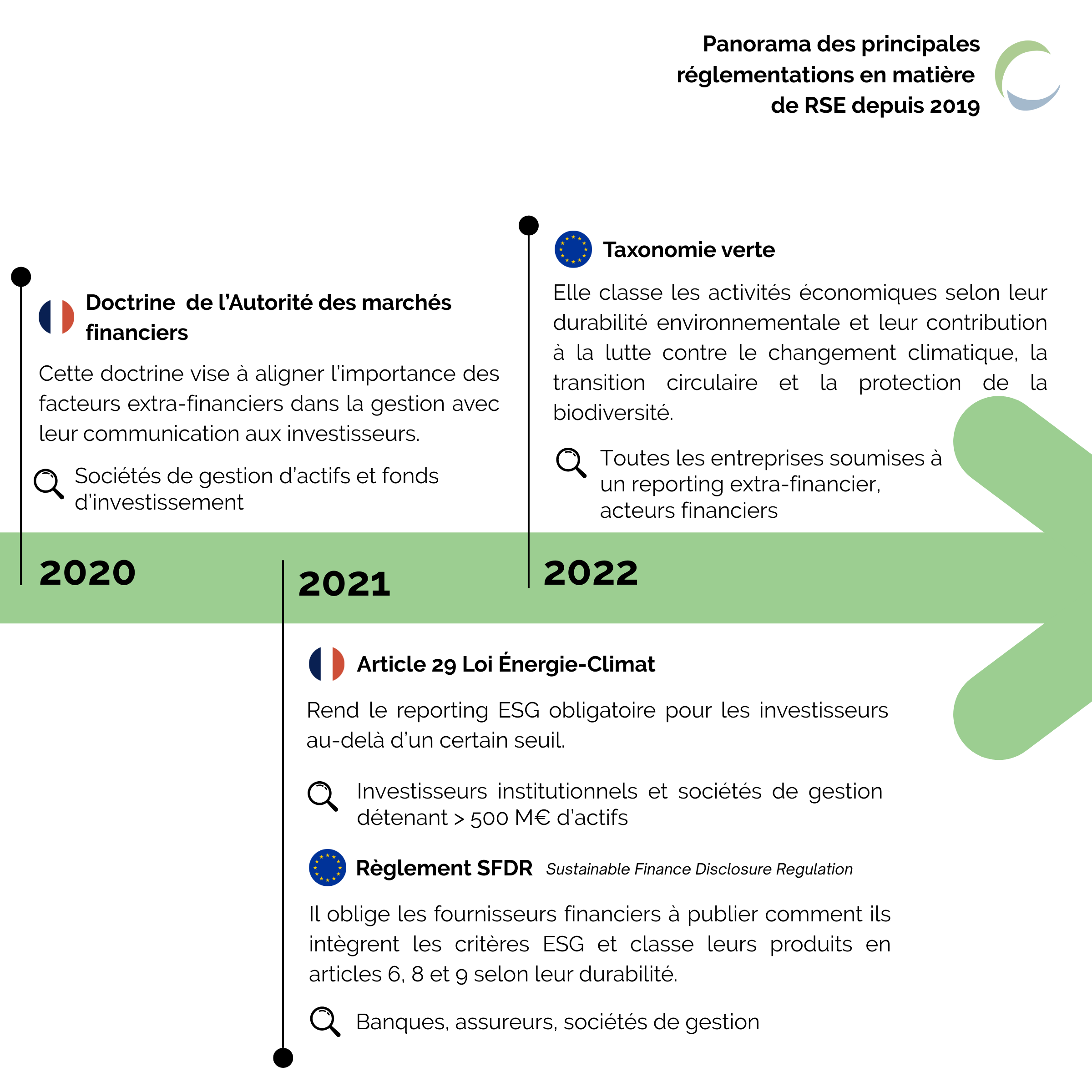 6 grandes étapes : de la Doctrine de l’AMF en 2019, Loi énergie climat, Taxonomie verte, CSRD, CS3D à la Directive Omnibus qui n’a pas encore été adoptée.